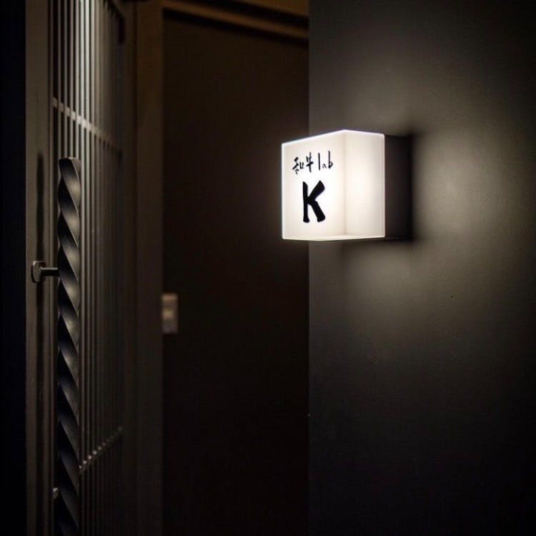 街中に静かに佇み、隠れ家のような雰囲気をまとう【和牛labK】。店内は黒を基調としたスタイリッシュな装い、静かに灯る印象的な照明は洗練された大人の空間になっています。焼き師を囲うように置かれた半円カウンターは2箇所完備。それぞれ焼き台が設置されていますので、焼き師による技、食欲のそそられる香り、滋味深い味わいなど臨場感たっぷりにお愉しみいただけます。当店の特等席で、思い出に残るディナーをお過ごしください。