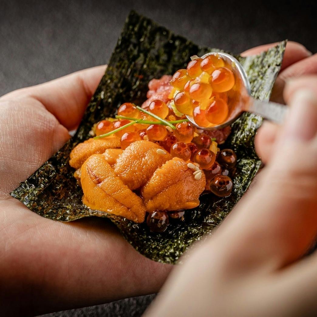 【鮨弥栄 別邸】では、暖かみのある雰囲気の店内で、職人が一つ一つ心を込めて丁寧に仕上げた、江戸前鮨ならではの味をお楽しみ頂けます。鮨に合った希少なお酒も数多くご用意。他にはない海鮮太巻き、当店自慢の蒸し鮑、是非ご賞味下さい。職人が創り出す握りと見る者を圧倒する極みの逸品は、口にした直後に唸るほど五感を最大限に刺激し感動を与えます。神楽坂駅から徒歩1分の別邸。本店とは違った味をご提供いたします。