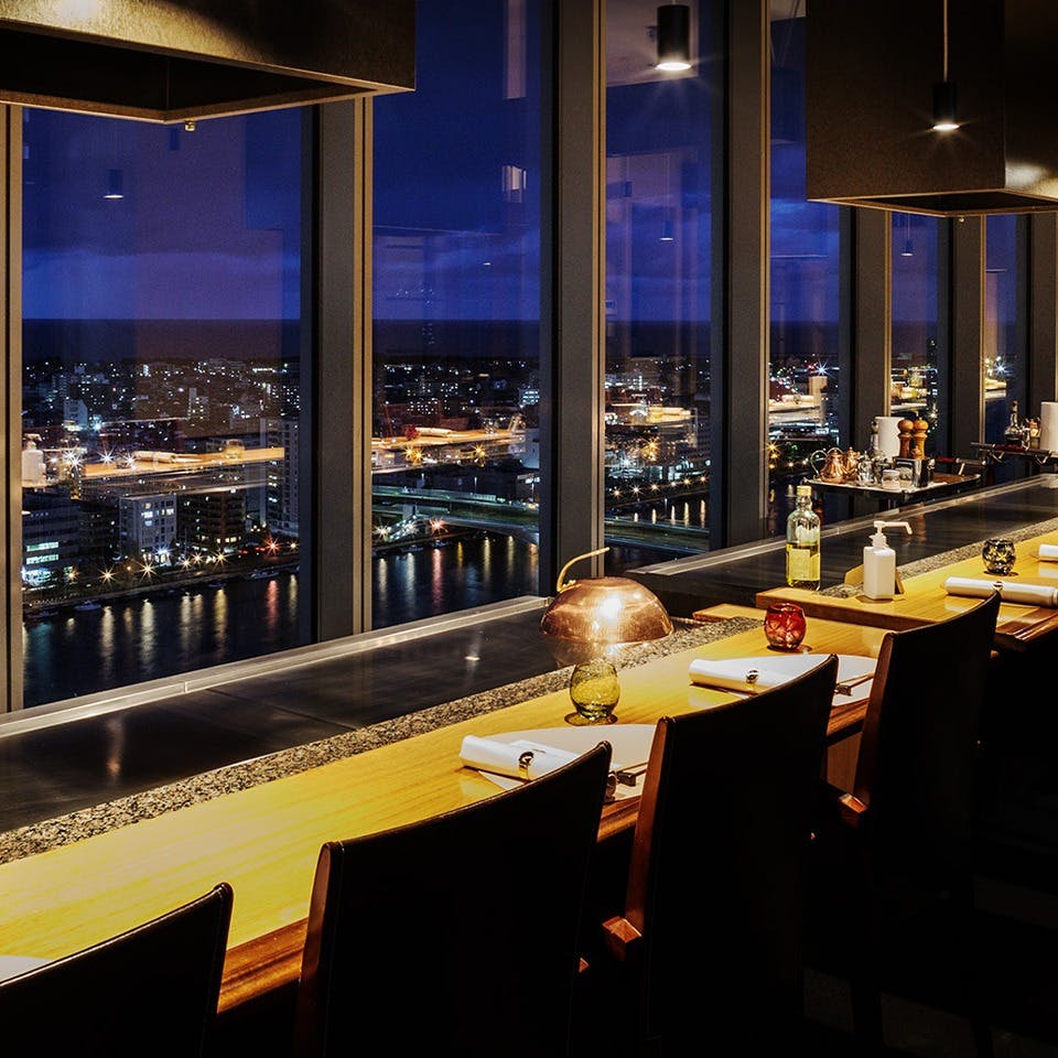 眼下には萬代橋と新潟島の街並み。遠くには日本海と雄大な佐渡を望む、地上100mのパノラマビュー。厳選素材と料理長が目利きしたハイクオリティなステーキを楽しむラグジュアリーな贅沢空間。記念日に、バースデーに。大切な人と記憶に残るひと時をお楽しみください。