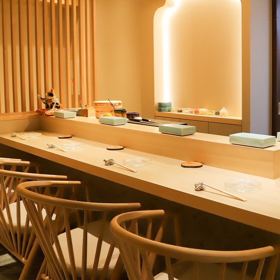 美食家が集う恵比寿の街に誕生した隠れ家高級鮨。外観はシンプルでシックな雰囲気。高級感感じる佇まいの中にも遊び心は忘れない。ソムリエの資格を持つ職人が厳選したワインと、日本酒マイスター厳選の日本酒。炭や瞬間薫製を用いた独創性溢れるメニューと季節の一品料理。テーブル席も完備されているため接待や会食、1万円以下では実現されてこなかった隠れ家高コスパ鮨を、心ゆくまでご堪能下さいませ。