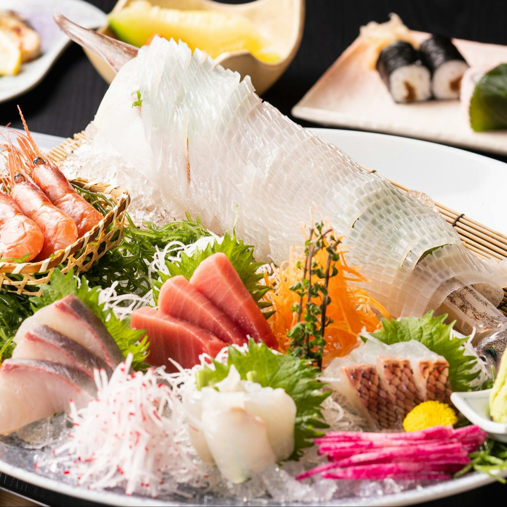 店内入ってすぐ、県内最大級のこだわりの“いけす”があり、それを囲むようにカウンター席がございます。生簀を眺めながら、ゆっくりとお食事やお酒を楽しめる!おひとり様も大歓迎。また、半個室(4名様まで)のお席もご用意しております。生簀からお客様に提供される活魚はどれを食べても絶品です。毎朝全国各地の漁港で水揚げされた旬の魚介をご提供できるのが当店の自慢。いろいろな味を少しずつ贅沢に、というのも乙なものですが、ここはカワハギやヒラメなどの活魚一匹物もおすすめしたいところ。新鮮な素材の味を、一匹分まるごとお楽しみください。