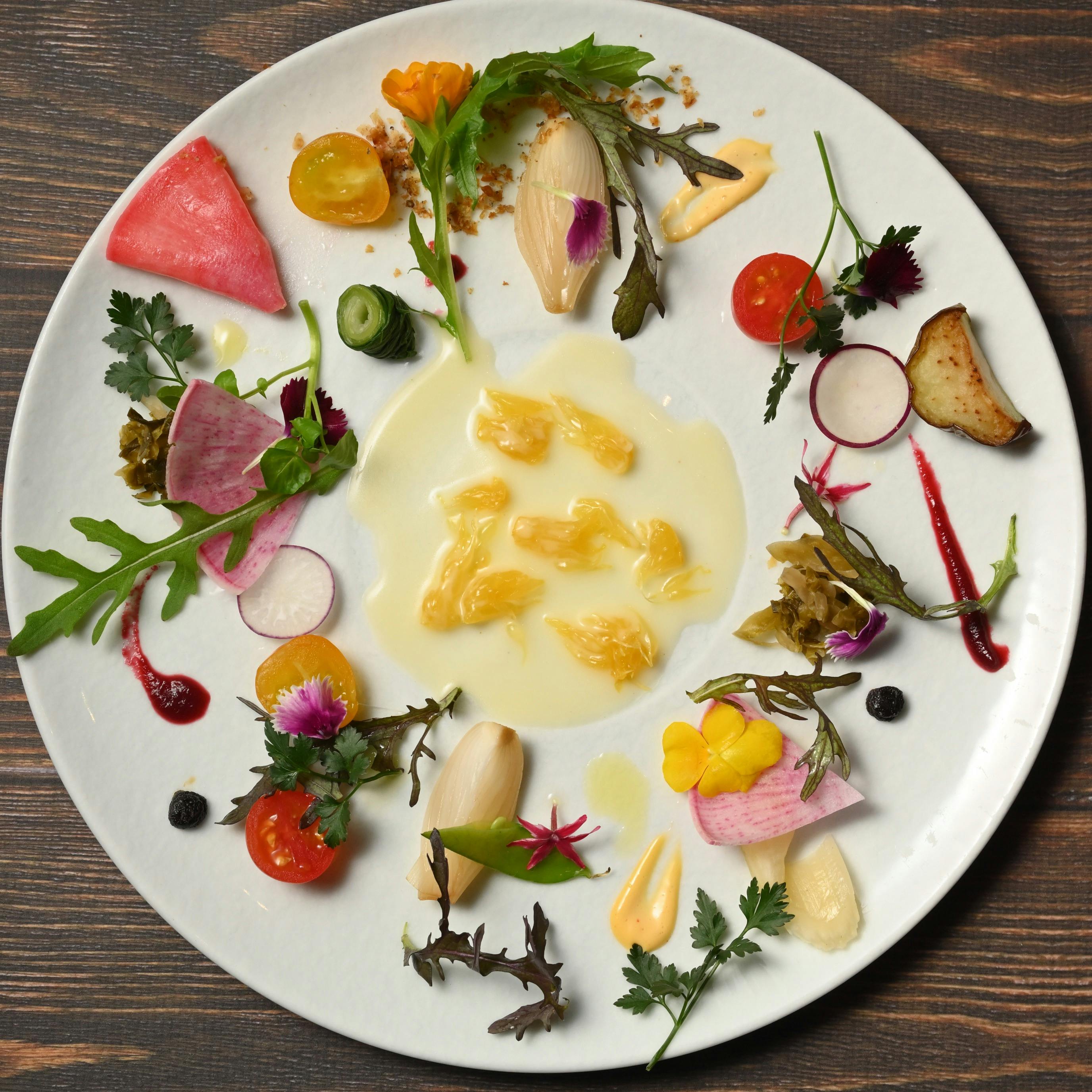 天神南駅から徒歩圏内の場所に店を構える隠れ家レストラン。和のアクセントを加えたフランス料理をベースに、野菜ソムリエが四季折々の食材で彩りを添えたイノベーティブフレンチをお愉しみいただけます。フルコース・ハーフコースとアラカルトメニューをご用意しておりますので、世界各地のワインとぜひご一緒に。お洒落な店内は、恋人との記念日や女子会にも最適です。肩肘張らない雰囲気の中、優雅な時間をお過ごしください。