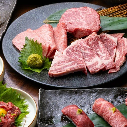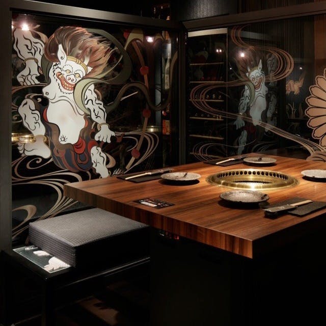 中目黒商店街の奥にある【都内でも数少ない和牛ユッケが食べられるお店】!系列に肉の卸し問屋を持つ当店は、希少部位の厳選和牛など肉の特徴や味の違いを楽しむことが出来ます。中でも人気なのは「お肉の刺身やユッケ」がです。 店内は和を基調とした落ち着いた雰囲気。個室は特別なシーンに庭園を眺めながら食事の出来る席です。半個室は仕切りのガラスに書かれた鯉が印象的なテーブル席です。