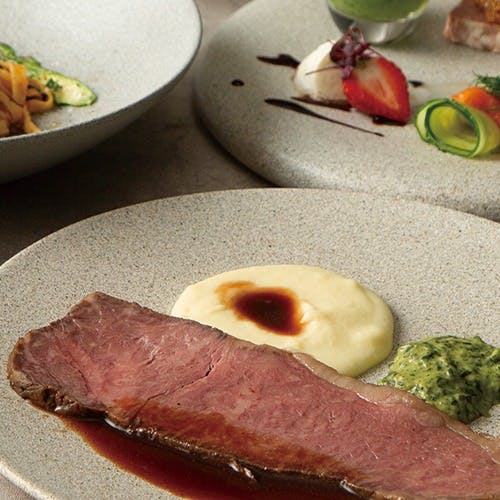 「正統的な本物のとびきり空間」がデザインコンセプトの店内では、月に数回色合いが変わる生花や上質なシャンデリア、インディゴブルーチェアなどが優美な雰囲気を演出。料理は、季節によって美味しさが変化する厳選食材を、選任シェフが腕を振るいゲストへご提供いたします。