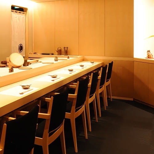 清潔感溢れるカウンター7席のみの和空間。肩肘張らずにこだわりの鮨や旬の食材を使ったお料理が愉しめます。おまかせコース2種のご提供ですが、事前予約でのご要望や追加の注文も承ります。また貸切でのご利用も可能で接待や会食などのビジネスシーン・大事な方との記念日・海外からの観光の方々も大歓迎です。