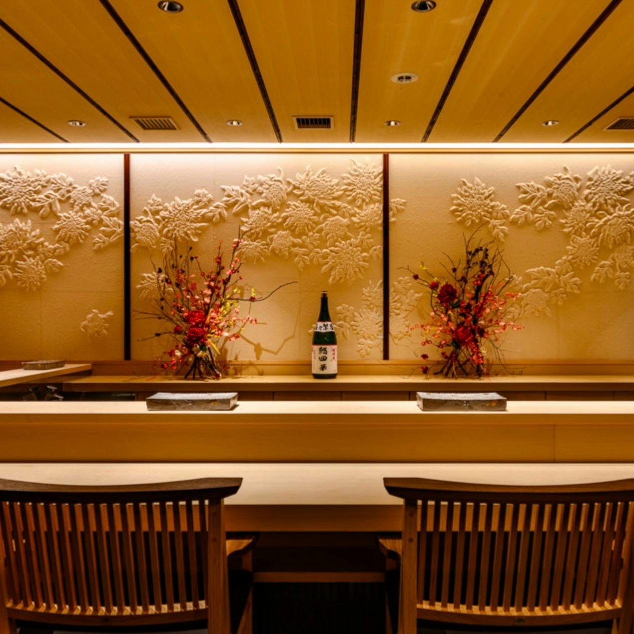 生花が彩る華やかな空間で、四季の味わいをお楽しみいただけます。毎日市場で選び抜く新鮮なウニをはじめ、こだわりの食材を使用したネタをご提供。落ち着いた雰囲気の中で、見た目も美しい『華の創作鮨』をご堪能いただけます。店内は9名様用のカウンター席と、6名様用のカウンター席のお部屋で分かれており、グループで個室のようにも利用いただけます。会食や接待、デートや女子会等にも最適です。華やかな盛り付けとともに、選び抜かれた食材の豊かな味わいをお愉しみいただける当店で、特別なひとときをお過ごしください。