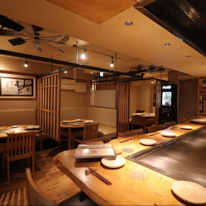 【ヨーロッパ発行のガイドブックや国内有名雑誌でも紹介】恵比寿駅すぐの立地ながら、都会の喧騒から離れてひっそりと佇む隠れた名店「不愛荘」。一見、お店とは思えないマンション一室の扉を開けると、木の温もりとモダンな内装が調和する大人の空間が広がります。多くのTV取材や著名人もお忍びで訪れる秘密の隠れ家です。匠の技を目の前で楽しめるカウンター席から、団体様でもゆったりお過ごしいただける個室までご用意しており、カジュアル接待や会食などに最適。こだわりの食材でつむぐ本格鉄板料理を心ゆくまでご堪能ください。