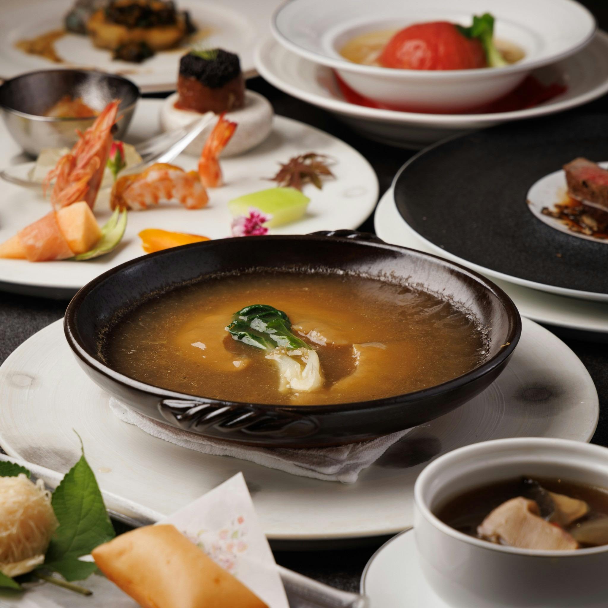 銀座駅徒歩4分のフカヒレ専門店。【手間ひまかけて仕込まれたフカヒレは、最高の食感を存分に楽しめます】高級素材フカヒレを一切の妥協なく丁寧に調理した、まさに本物の贅沢を感じる一皿。1周年を記念し、トリュフ入りフカヒレの姿煮・和牛ステーキ付きの特別コースをご用意しております。芳醇にして軽やか、広東料理の真髄をお届けいたします。高級感に包まれた落ち着いた雰囲気の個室で、街の喧騒を忘れて至福のひとときを。