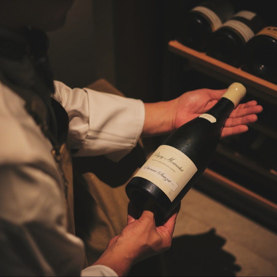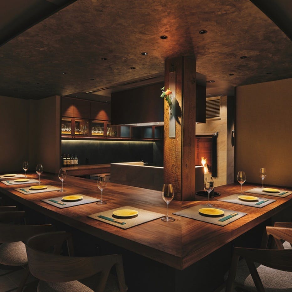 扉を開けると広がる、薪の火を囲むカウンター席のプライベートな空間でシェフの技を目の前でお楽しみください。その光景はまるで別荘に招かれたかのような居心地の良さを感じていただけます。お料理は京都産の地鶏や旬の野菜を炭や薪を使い分けて丁寧に調理し、素材本来の美味しさを引き立てたコースをご提供。貸切りも承りますので、さまざまなシーンでのご利用をお待ちしております。