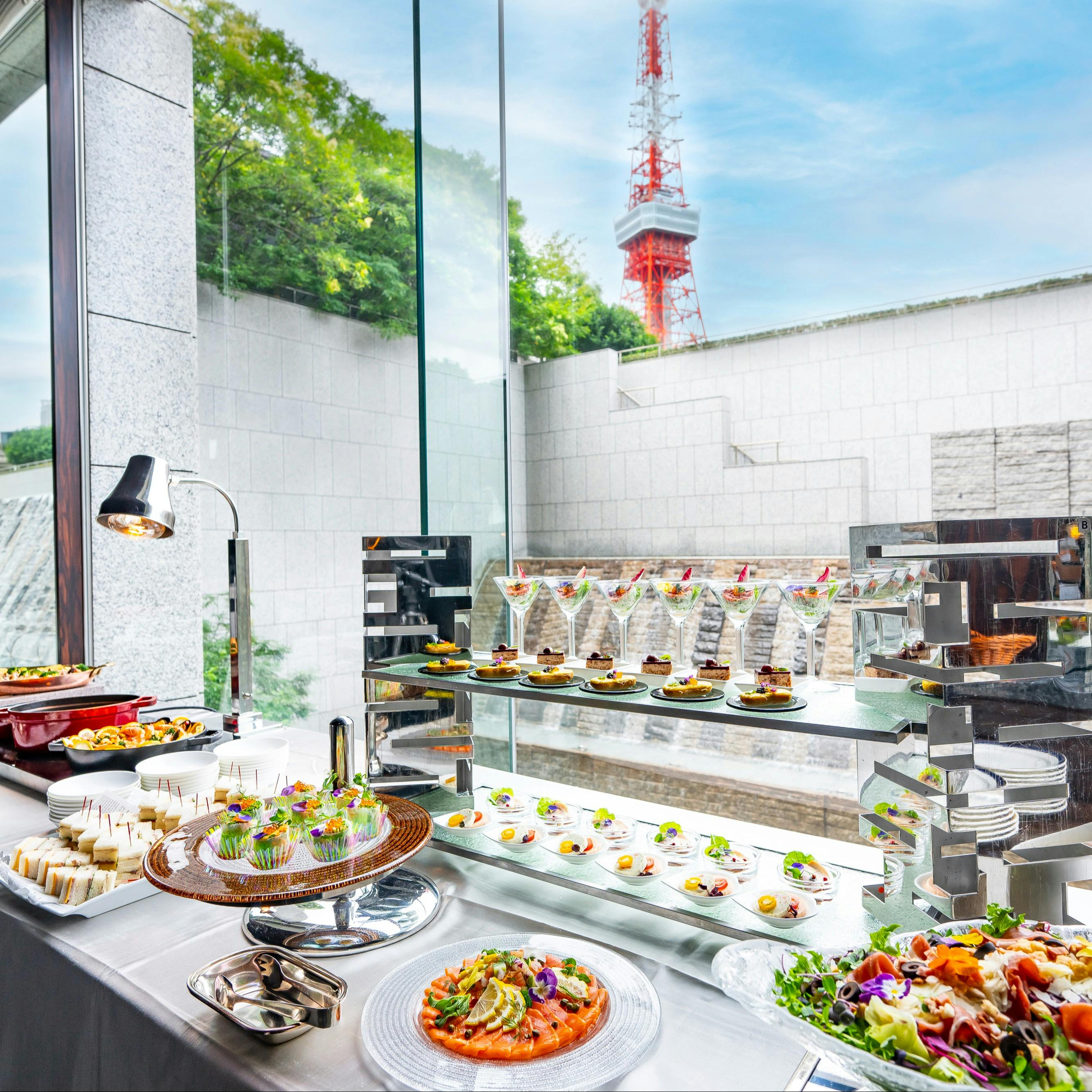 音響設備やステージ、洗練された照明が整ったイベントホール。東京タワーを間近に眺めながら、アフターウエディング、パーティー、ライブや発表会など、多彩なイベントにご利用いただけます。お食事付きプランのほか、食事なしの会場貸切でもご利用いただけます。昼は大きな窓から降り注ぐ自然光が明るく開放的な雰囲気を演出し、夜は東京タワーのライトアップがシックで高級感のある空間を彩ります。着席時は最大50名様、立食時は最大70名様まで対応可能で、バーカウンターも備えた広々とした会場は、忘新年会や結婚式の二次会、演奏会にも最適。見た目も華やかな料理と、 季節感あふれるお飲み物がパーティーをさらに盛り上げます。特別なひとときをぜひお過ごしください。