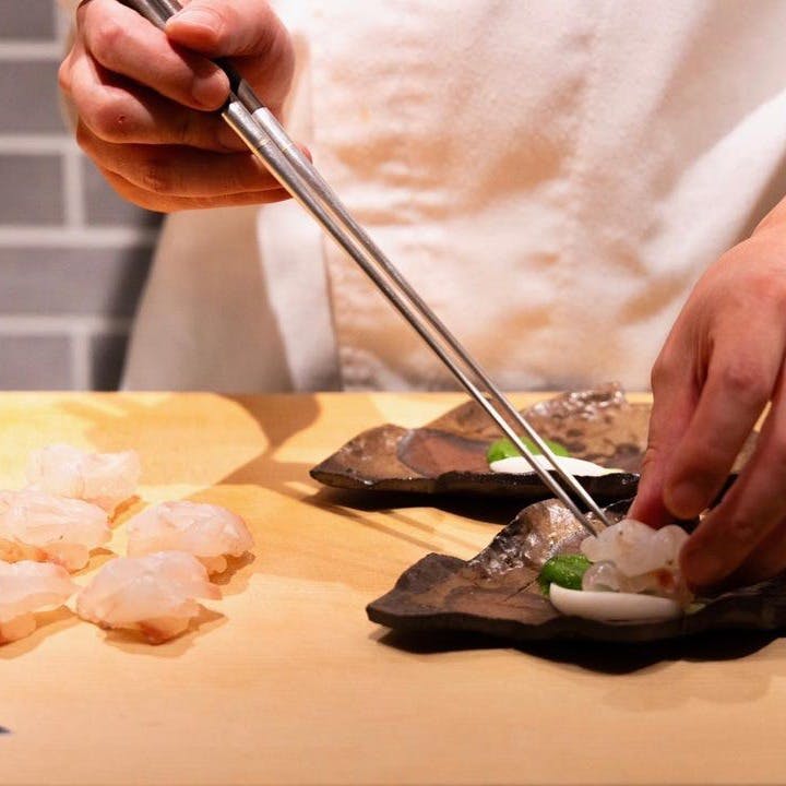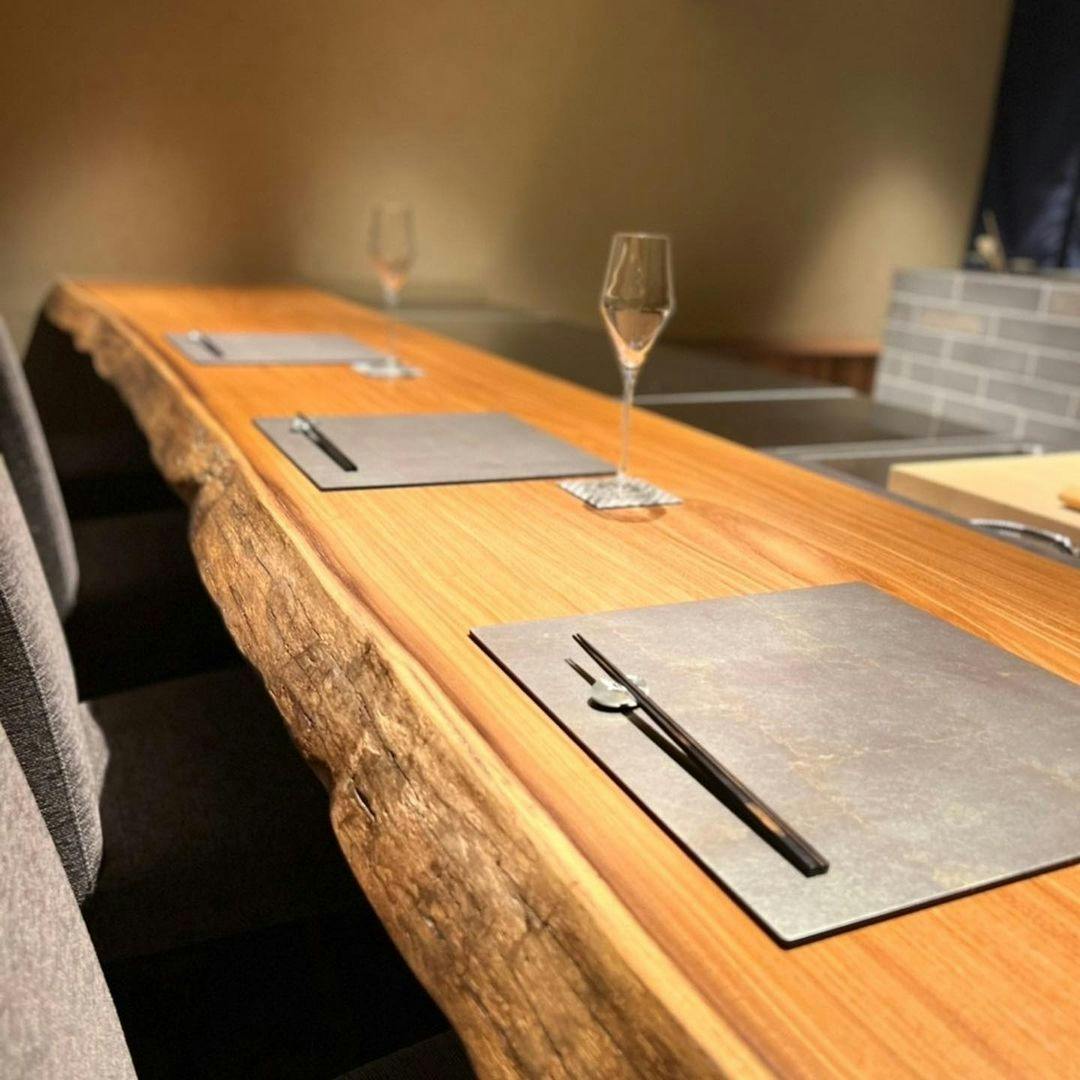 一枚板のカウンター席で、オープンキッチンの職人技を目の前で体感。料理の美しさと技術を同時に楽しむことができる贅沢なひとときです。