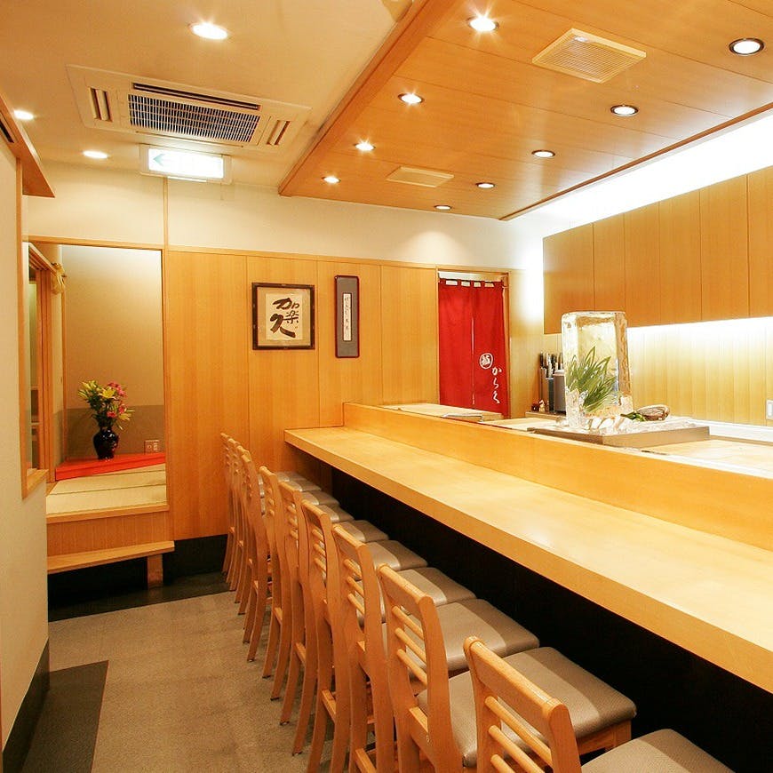 銀座駅からすぐの好立地にある「鮨 からく」。店内は落ち着いた雰囲気で、ゆったりと寛いでお食事頂くことができます。職人が時間をかけて魚を下ごしらえし魚の旨みを十分に引き出す昔ながらの江戸前鮨は、ソムリエの資格を持つ大将が選ぶワインとも相性がぴったりです。こだわりの江戸前鮨をご堪能ください。