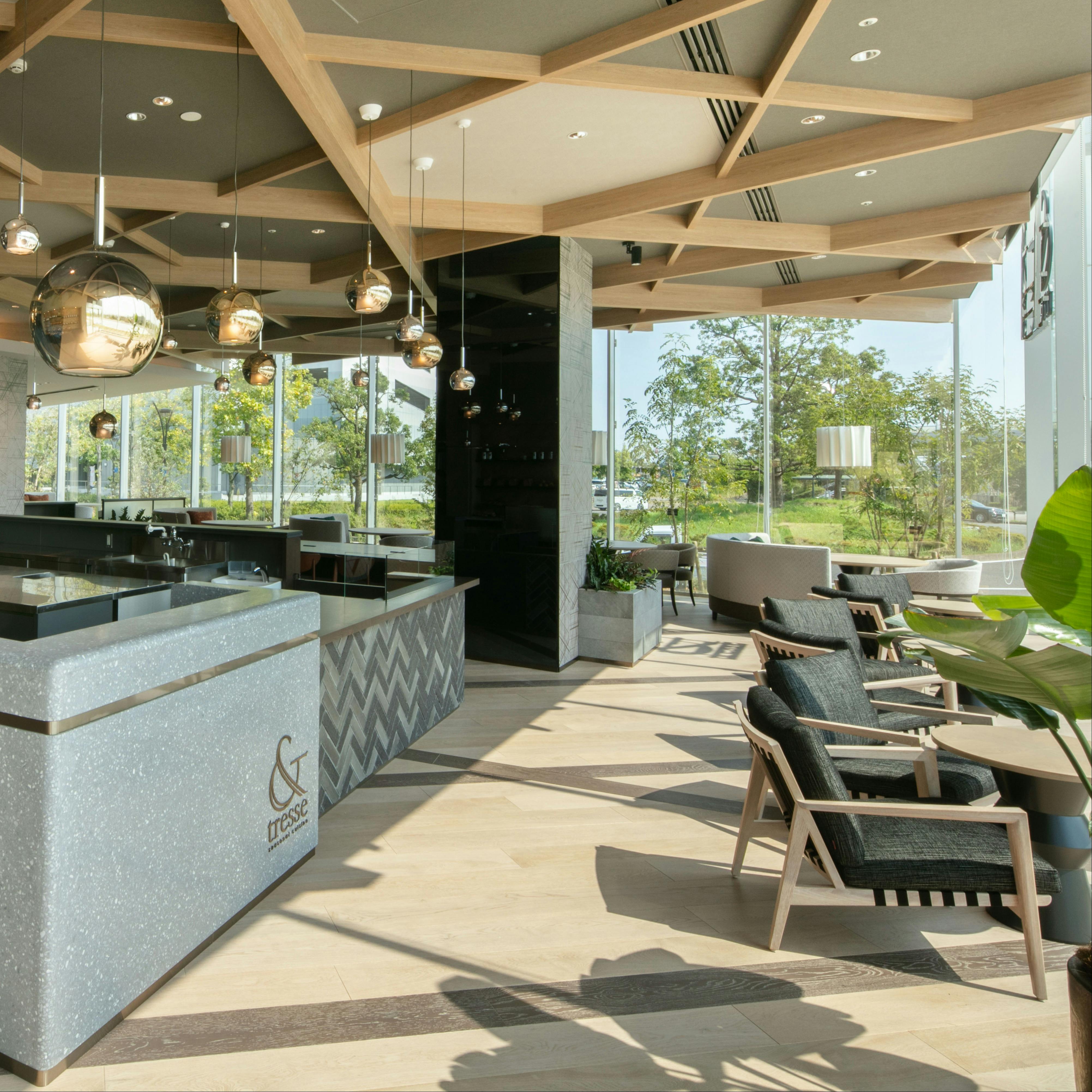 「&」が象徴する“つながり”と、フランス語の「tresse」が持つ“編み物”や“組み紐”の意味。その二つを掛け合わせた名前には、人、街、地域、スポーツ、食といったさまざまな要素を通じて、人々をつなぐ架け橋となりたいという願いが込められています。 当店は、ランチタイムからディナータイムまでご利用いただけるオールデイカフェレストラン。ホテルシェフの豊富な経験から生まれる料理と、店内で焼き上げた自家製パンが自慢です。 ここでしか味わえない特別なひとときを、ぜひお楽しみください。