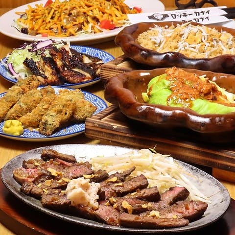 有楽町駅直結、有楽町電気ビルにある「ロッキーカナイ」は、肉料理が自慢の活気ある居酒屋です。低温調理で仕上げたローストビーフなどが並ぶ名物「レッドカーペット」や、高さのある「黒唐揚げ」は、味はもちろん見た目のインパクトも抜群。お酒が進むメニューが豊富で、コスパの良さも好評です。広々とした店内は、仕事帰りの一杯や仲間内での宴会にぴったり。元気なスタッフが皆様をお迎えします。ぜひご予約ください。