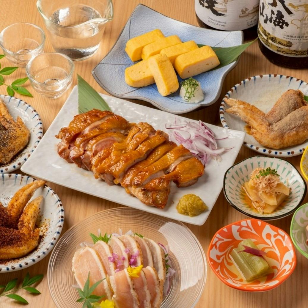 天神で福岡名物堪能!福岡県産「はかた地どり」を使用した料理を楽しめる贅沢なコースをご用意。2時間飲み放題付なので、お酒も一緒に心ゆくまでお楽しみいただけます。もも串やむね串など、はかた地どりづくしのコースになっております。