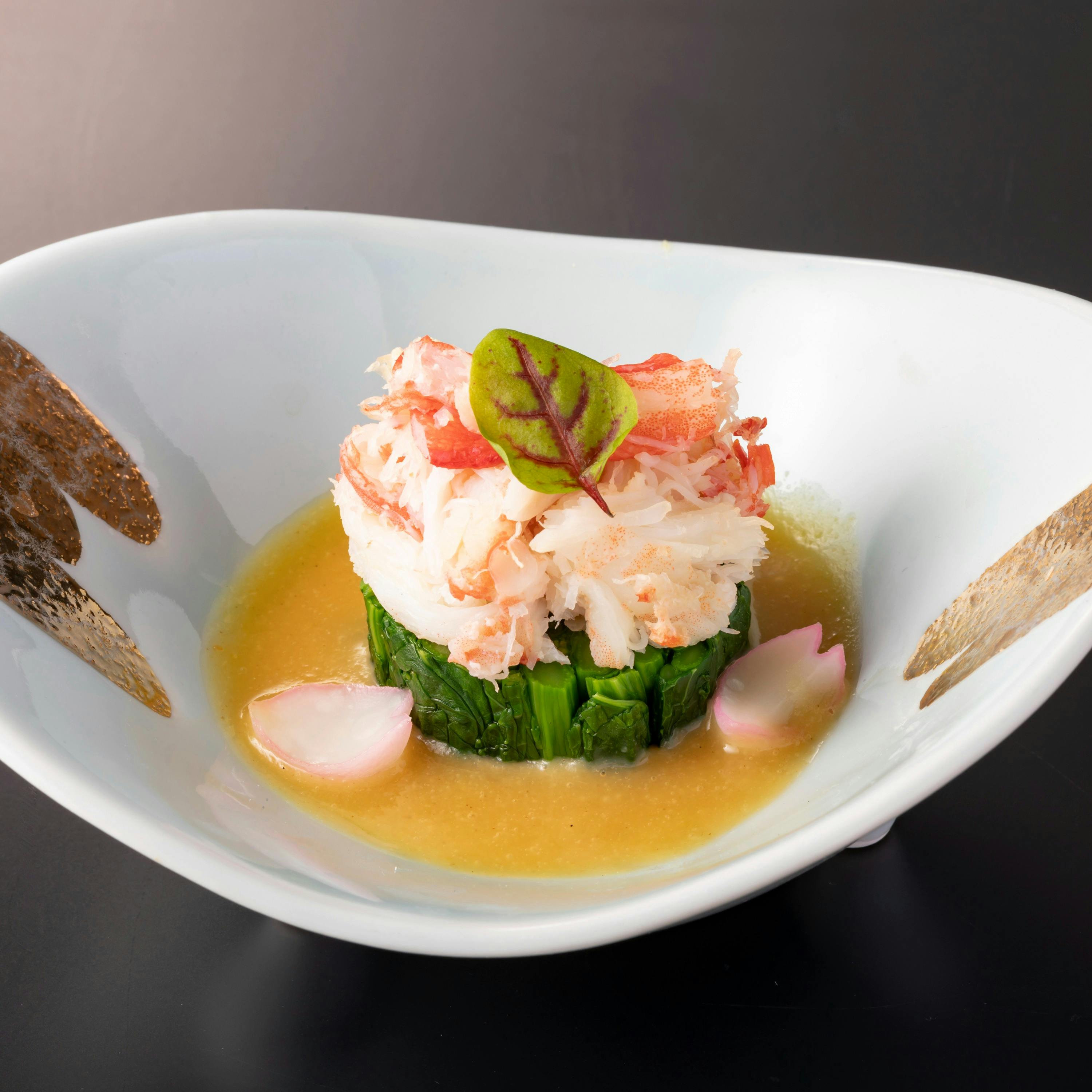 厳選された食材と職人の技が織りなす極上の料理をご堪能ください。旬の味覚を活かした繊細で奥深い味わいが、一皿ごとに感動を呼びます。落ち着いた静かな空間で、大切な方との特別な時間を。心を込めたおもてなしと、四季折々の美味が、訪れるたびに新たな発見をもたらします。蟹会席コースは9,000円より。上質なひとときをお楽しみください。