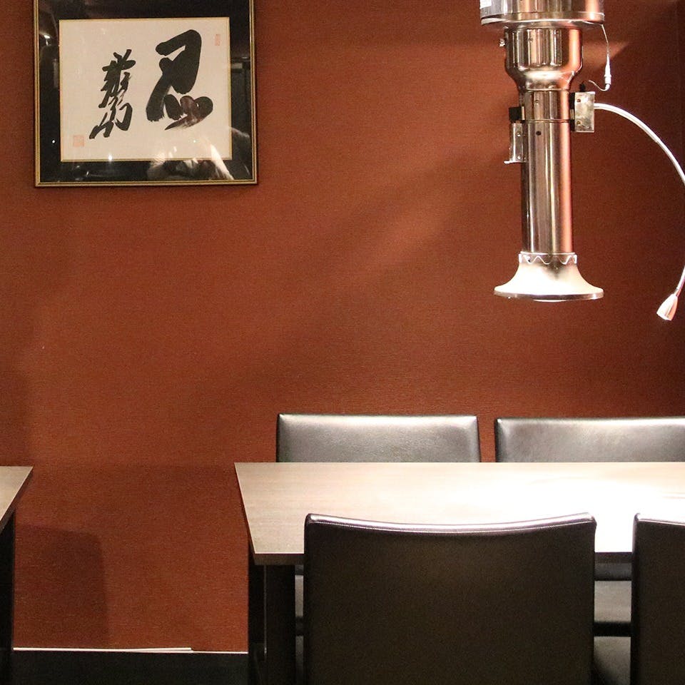 黒を基調とするシックな空間には4名テーブル席を4卓 完備。無煙ロースターを完備しているので、デートや接待でも安心して焼肉も楽しめます。誕生日などの特別な日に大切な人を招きたくなる一軒です。最大16名様の貸切にもお使いできますので、どうぞお気軽にお問い合わせください。