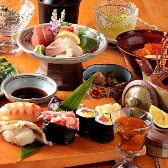「うえ川」では、その時季ならではの旬素材を使ったお寿司や和食をご提供しております。 内容は日替わりとなっておりますので、毎回違う美味しさをご提供。 日本酒・ワイン・焼酎など、料理と相性の良いお酒も種類豊富にご用意しております。 きりっとした味わいのオリジナル日本酒「うえ川」もおすすめです。