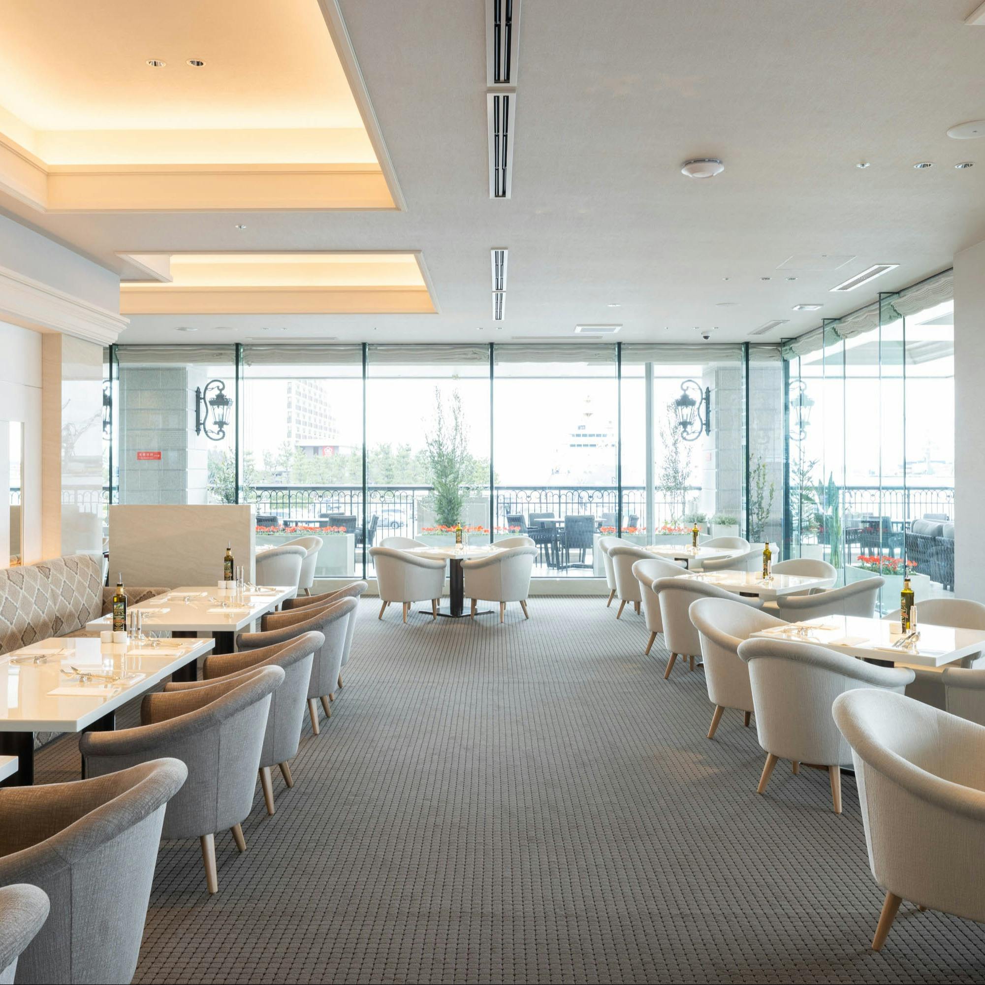 南側と西側がすべてガラス張りの窓になっており、日中は太陽の光が明るく差し込み、夜には美しい神戸の夜景が広がります。イタリアンやフレンチをベースにしながらもジャンルにはしばられないレストランとして、総料理長の笠原 鉄平が腕を振るう華麗な料理をお愉しみいただけます。