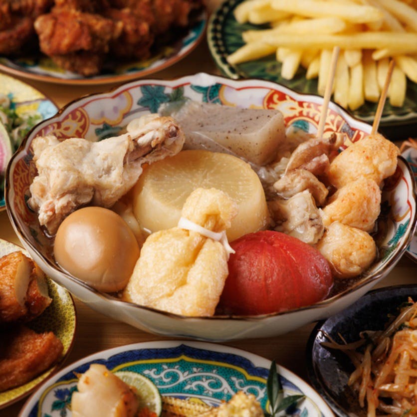 おでん、牡蠣、和牛、日本酒をリーズナブルに楽しめるお店! 少人数~団体様までご利用OK!2H飲み放題1980円 当店看板メニュー+飲み放題付付きコースは全4種類。 ※当店の看板商品 【おでん→しじみ出汁おでん】 【牡蠣→信頼できる所から毎日仕入れ!味も鮮度も抜群!】 【和牛→こだわりのお肉A3以上の仕入れ】 【日本酒→日替わり47都道府県ご用意、日本酒初心者の方でもOK!日本酒は410円~】