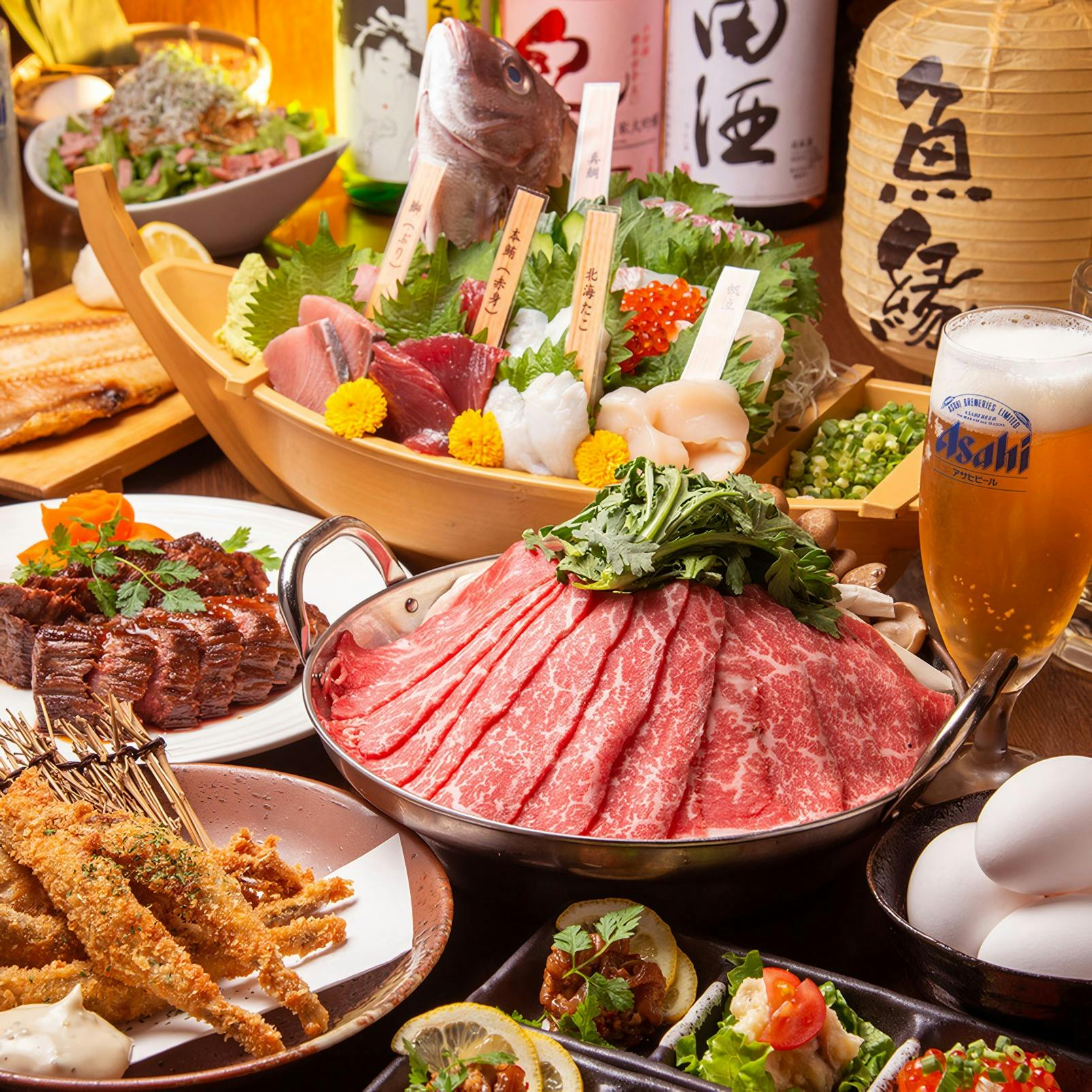 上野駅近くに位置する「全席個室 鮨と酒 魚縁」は、漁港直送の新鮮な魚介を刺身、炭火焼き、天ぷら、鍋、寿司など多彩な調理法で楽しめる居酒屋です。全コースに生ビールを含む3時間の飲み放題が付いており、銘柄酒も豊富に用意されています。