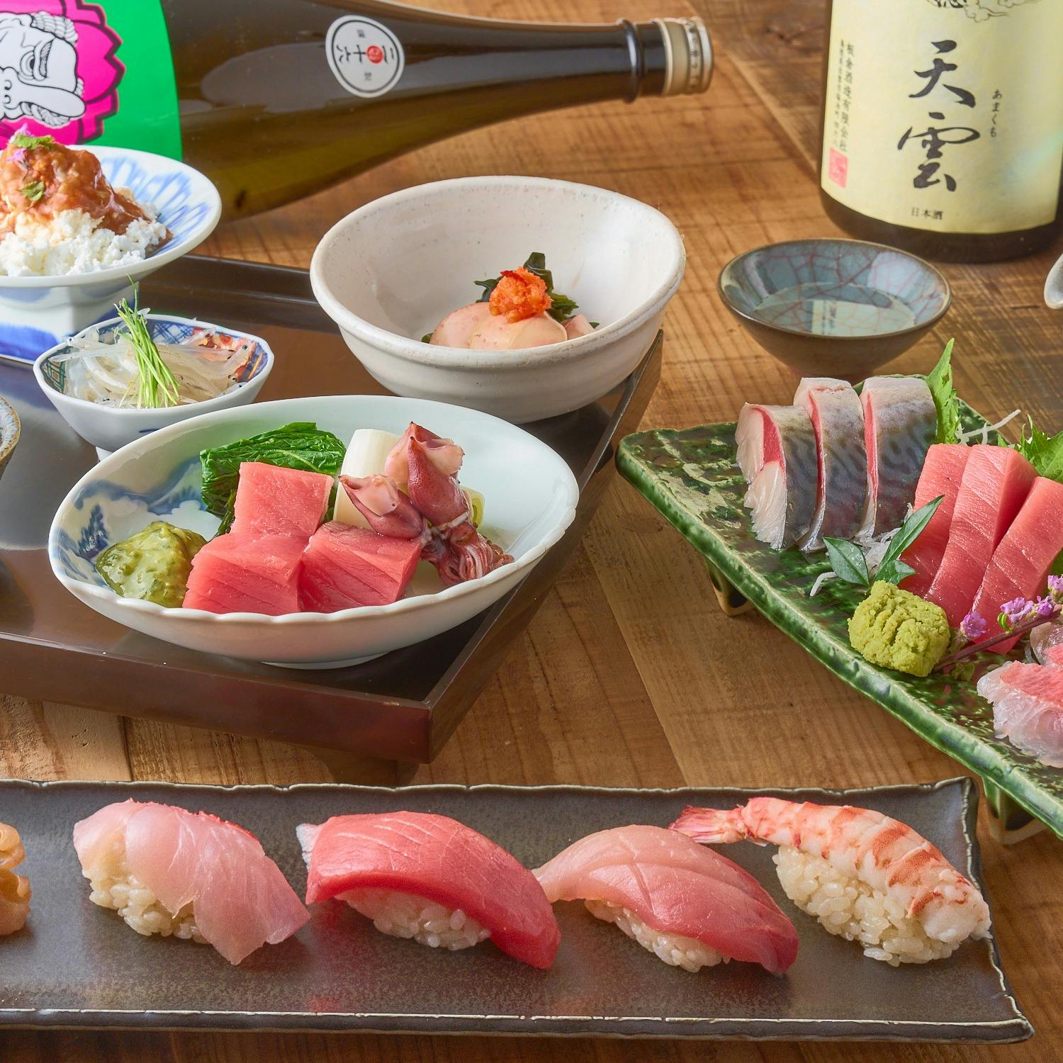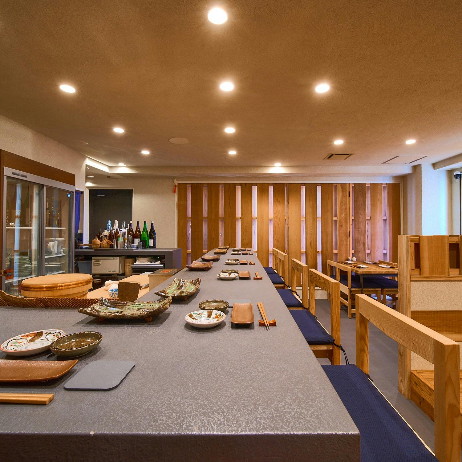 厳選された旬の食材と、職人技が織りなす珠玉の寿司。熟練の職人が、一つひとつ丁寧に仕上げる寿司は、さまざまな味わいをお楽しみいただけるよう上品なひと口サイズでご提供いたします。シャリには寿司に最適な米を厳選し、赤酢を合わせることで、素材の旨みを引き立てました。また、新鮮なお造りや、四季折々の地元野菜を使用した繊細な前菜など、趣向を凝らした逸品料理も充実。昼飲みにぴったりのランチコースから、当店自慢の味を存分にご堪能いただけるディナーコースまで、多彩なメニューをご用意しております。寿司の美味しさをさらに引き立てる日本酒も、選りすぐりの銘柄を取り揃えました。心地よい屋久杉の香りが漂う落ち着いた空間で、極上の寿司と日本酒 のマリアージュを、どうぞごゆっくりとお楽しみください。