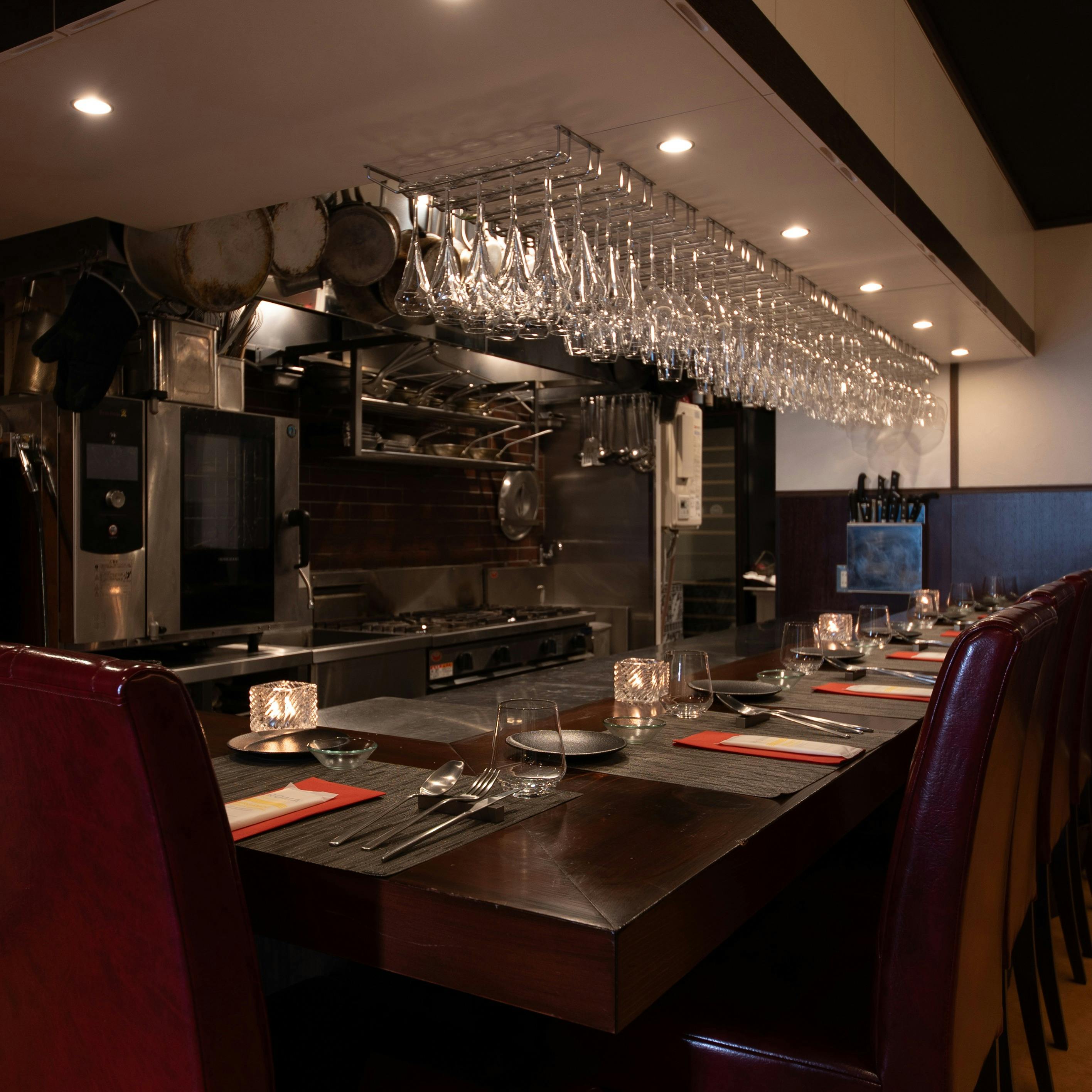 「レガーメ神楽坂」では、圧倒的に人気のカウンター席で、当店のシェフ「蒲生弘明」が織りなすライブ感溢れる料理をご堪能いただけます。目の前で仕上げられる一皿一皿に、シェフのこだわりと技術が感じられ、食事の時間が特別なひとときに変わります。また、イタリアンワインを熟知したソムリエでもある蒲生は、料理に合 わせたワインのセレクトはもちろん、ワイン初心者から上級者までそれぞれの好みに応じた最高のペアリングを提案し、多くのファンに支持されています。ボトルワインは105種類以上、珍しいワインや希少な年代物も取り揃え、料理との相性を最大限に引き出すワインをお楽しみいただけます。神楽坂での特別なひとときを、レガーメでお過ごしください。