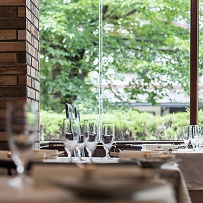 印象的な大きいガラス窓からは北白川沿いの風景を眺めることができます。季節により姿を変える美しい景色が特別な時間を演出します。心を込めてお届けするお食事・美酒を心ゆくまでお愉しみください。