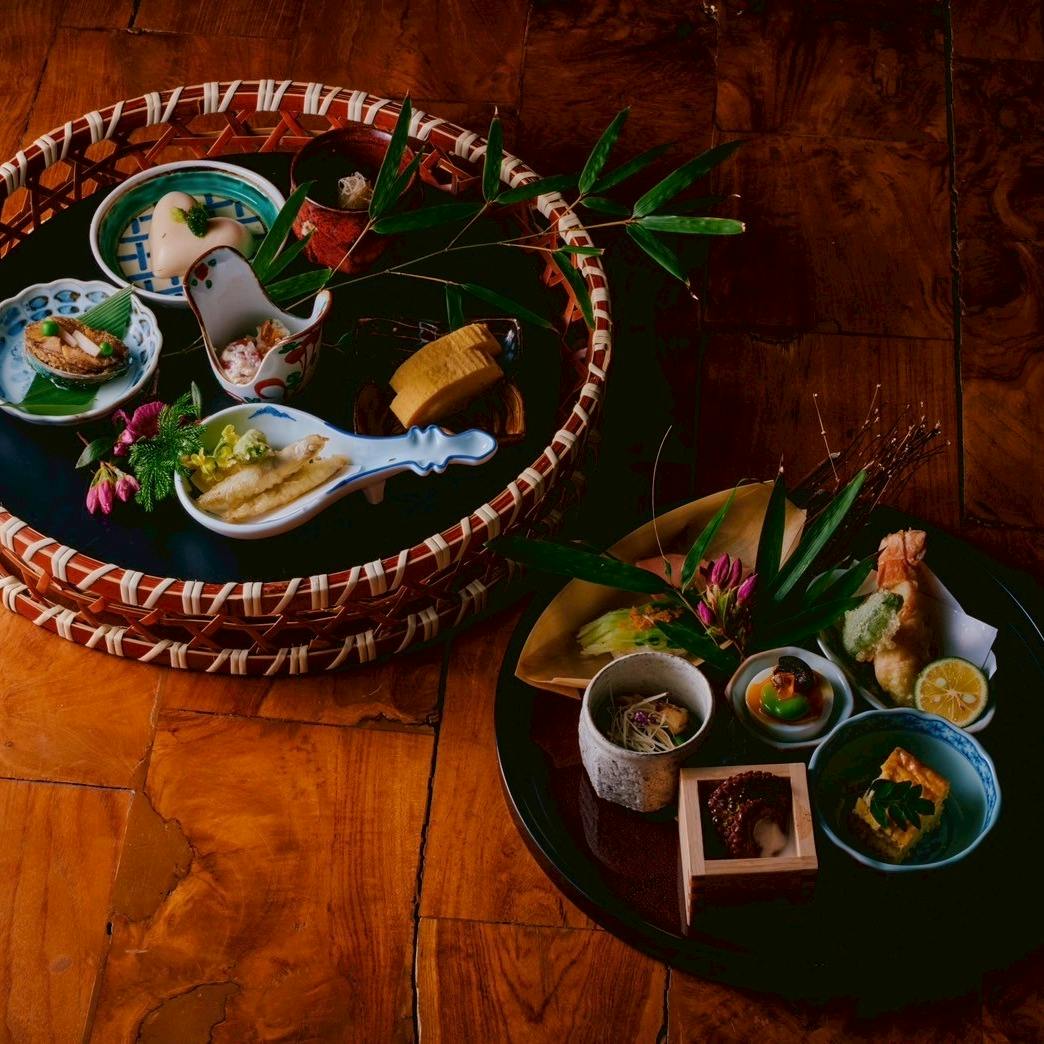 淡路島の食文化を継承する和食料理を踏襲し、厳選した旬食材と調味料を日本の伝統と革新的な技法で仕立てた料理をお愉しみいただける御食国和食コースをご用意しております。伝統的な「和」の技法を使用した和食コースと、「和」と「西洋」の文化を織り交ぜた革新的な創作和食コースの計2種を用意。書家 紫舟氏による作品や陶芸家 木村盛康氏による骨董品などの日本の伝統文化に拘った店内や、季節ごとに色づく庭園を目の前に、ゆったりとした空間で御食国の和食をお愉しみいただけます。