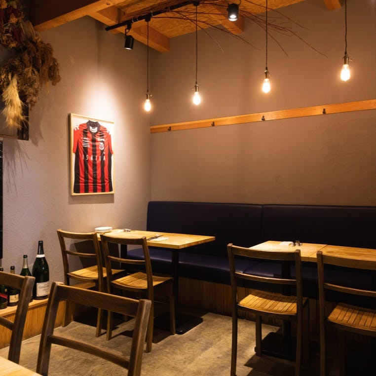 古民家を改装した店内は、残されたままの古木の柱や、子供達が描いたラクガキに手を加えた壁一面のアートなど、至る所に遊び心が!テー ブル席は、家族、同僚、友人と美味しく楽しく乾杯。お一人様も大歓迎のカウンター席は料理している所を眺めながら、ゆったりと。天気の良い日に設ける店外の立ち呑みテーブルは、ふらっと一杯にぴったりです。様々なシーンで楽しめる、居心地の良い酒場です!