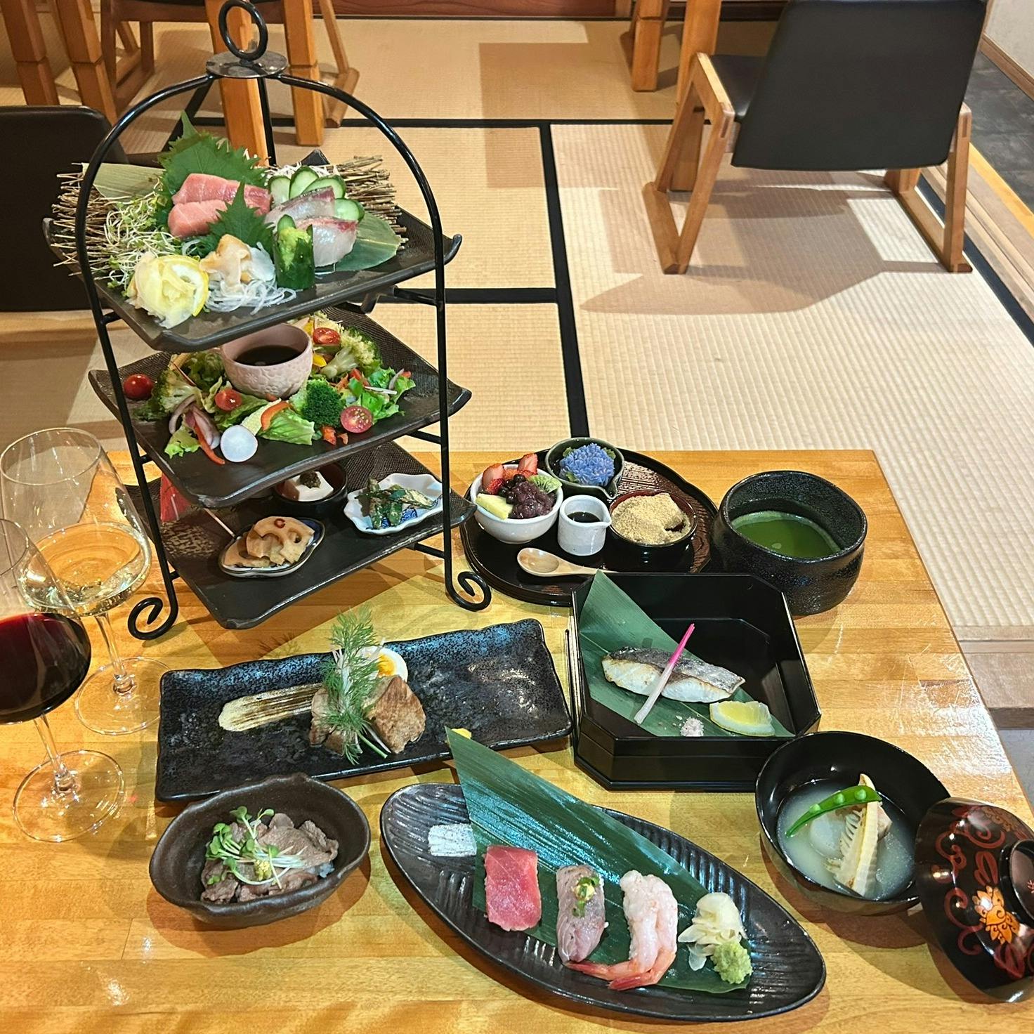 湯島天満宮のほど近く、茶道の精神を現代に昇華させた「夜咄松緒」。 懐石の伝統に倣い、手まり寿司や季節のおばんざい、焼物・揚物を三段重に美しく盛り込んだ「イブニングティー」は、和のアフタヌーンティーとして特に女性に人気を博しています。 特筆すべきは、ソムリエ資格を有する女将によるワインペアリング。 和の繊細な味わいと調和する銘醸ワインが、ひと皿ごとに奥行きある余韻をもたらします。 心をほどくようなもてなしで、大人の夜を静かに彩ります。
