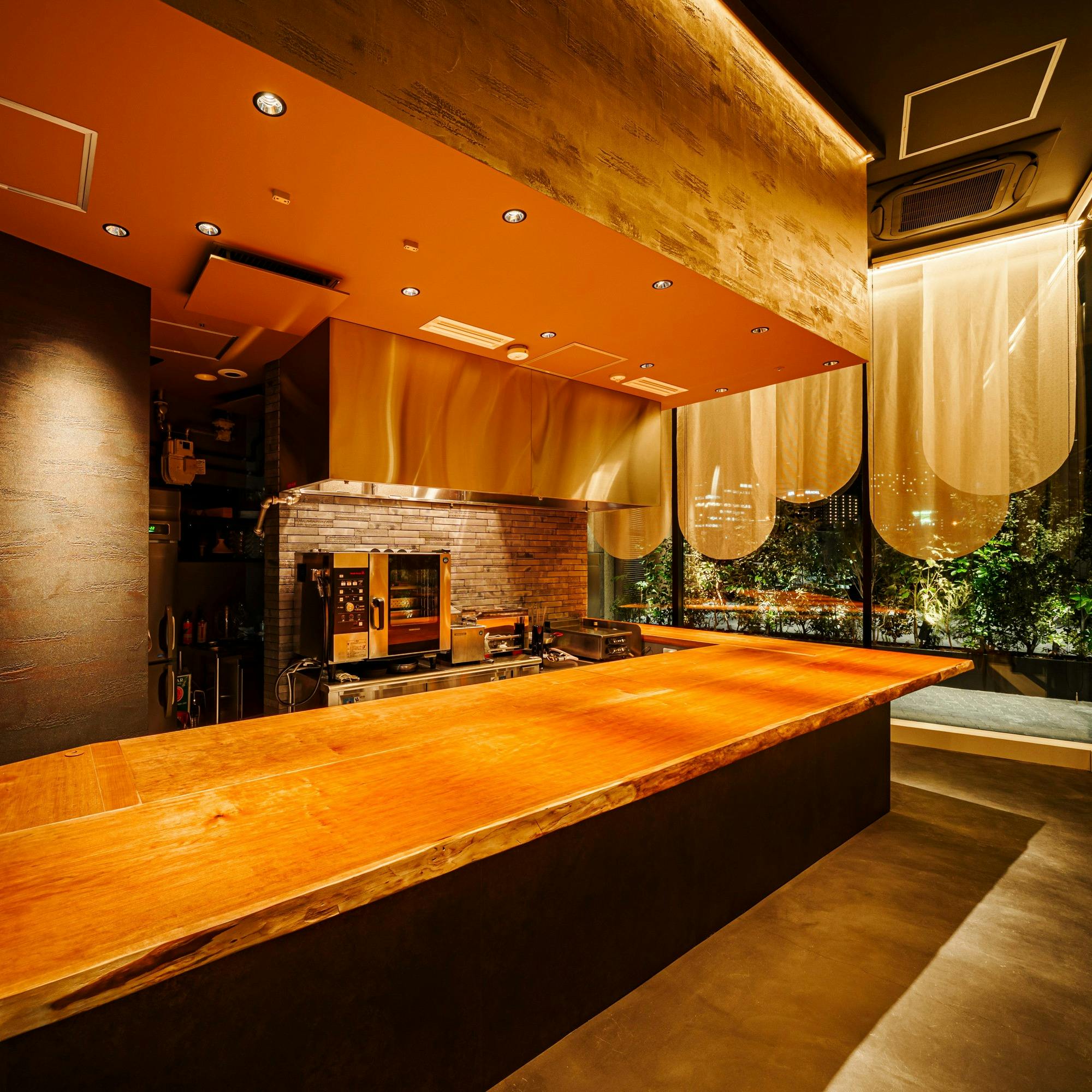 大阪の中心地のレストランでございます。店内は、シックな大人な雰囲気で、都会の喧騒を忘れるリラックスした空間を演出いたします。カウンター席ではライブ感を味わえ、お料理を手渡しでお出しするなど、ワクワクするような魅力がございます。また、大事な方との食事をゆったりとお食事をお愉しみいただける個室のテーブル席もご用意しております。高級感と居心地の良さが融合する上質空間で素敵なひと時をお過ごしください。