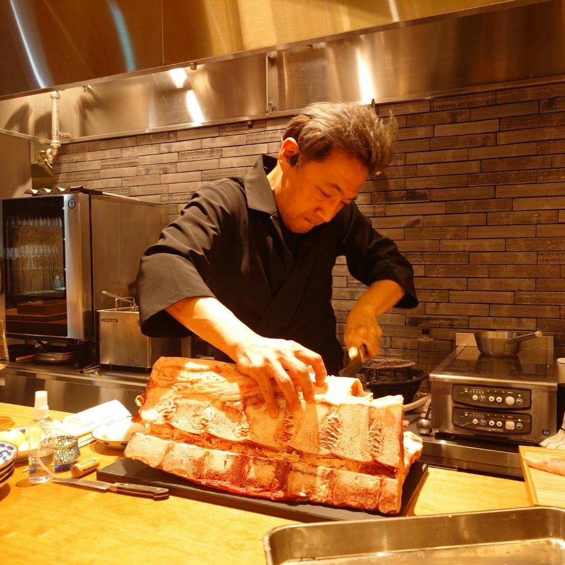 Leone吉川健太郎は全国各地、世界中から取り寄せます。真っ赤なスペインの海老、北海道のジューシーなアスパラガス、豊後水道の光り輝く白甘鯛…。そして大阪では数件しか取引してないサカエヤさんの熟成牛!旨みが凝縮された熟成牛は高く積みあげられた炭火でガリッとと香ばしく焼きあげます。新進気鋭の現代作家の器とともにお楽しみください。