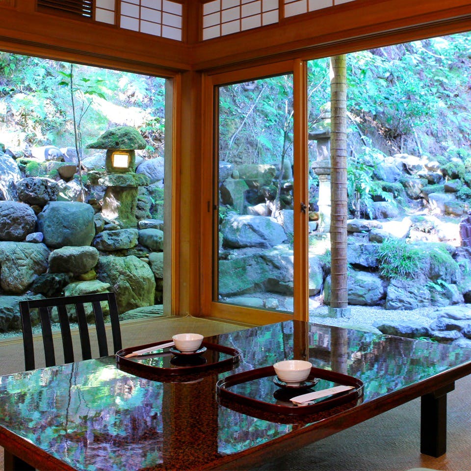 四季折々の彩り豊かな日本料理を、趣ある日本座敷でゆったりとご堪能いただけます。すべてのお席からは加茂山と美しい庭園の景色を一望でき、心落ち着く贅沢なひとときを演出。大切な方との会食やご接待にも最適な空間で、和の風情とおもてなしをお楽しみください。