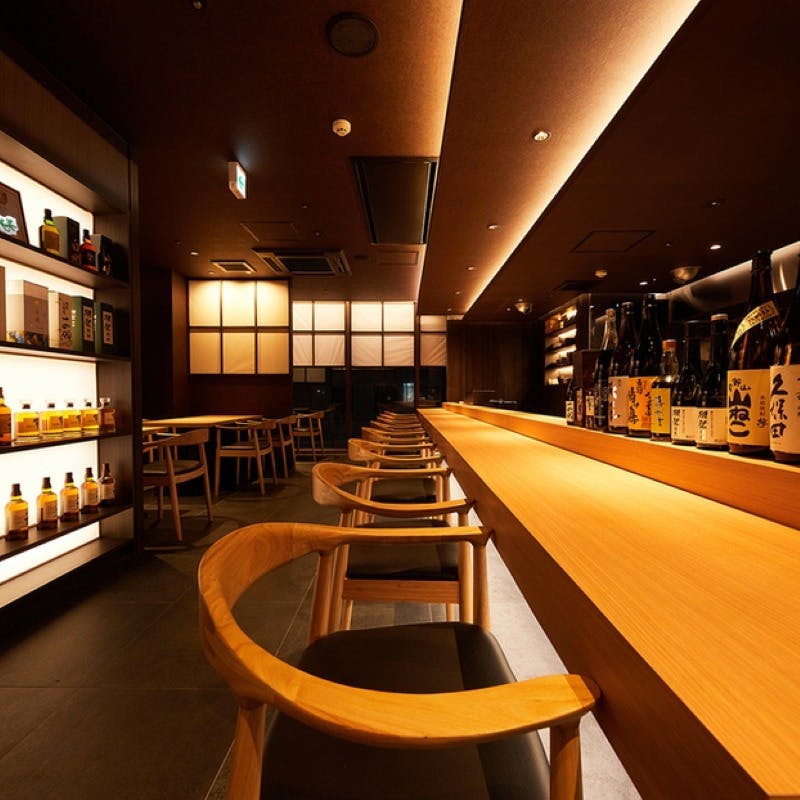 居心地の良さを追求した店内は、デザイナーによる監修のもと、温かみのある木目調のカウンター席や、柔らかな間接照明が優しく店内を彩ります。和モダンの美しさが融合した空間で、リラックスしたひとときをお過ごしいただけます。また、ゆったりと広々としたテーブル席もご用意しております。