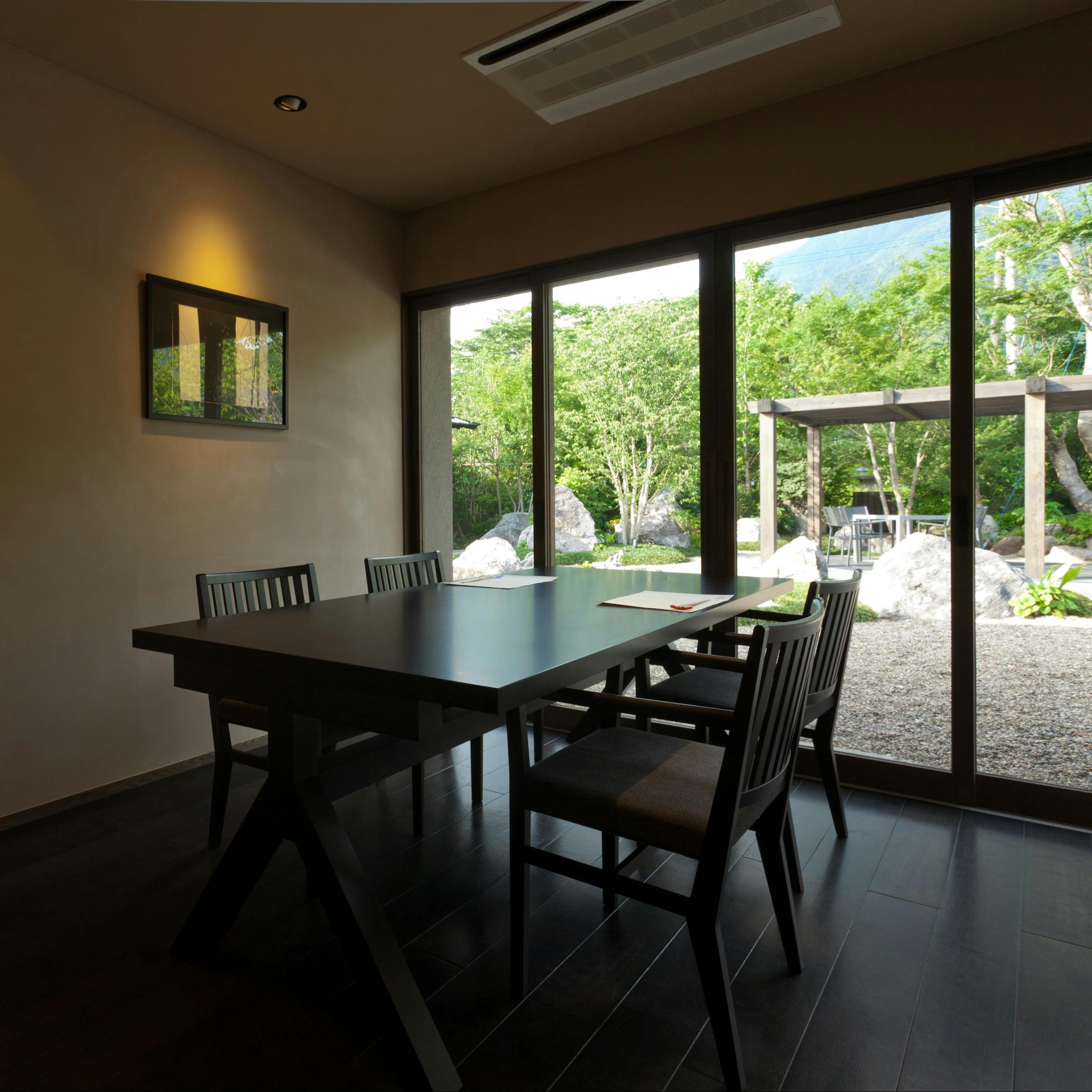 贅を尽くした食材とこだわりの器、行き届いたもてなし、そして熟練の匠の技による料理を存分にお楽しみいただけます。大きな梁や漆喰壁、石張りの床に暖炉。ラグジュアリーかつモダンな空間に、和のテイストが融合した「ダイニング 十和蔵」。地元産の食材や旬の食材を厳選し、有田焼や富山の職人が手がけるガラス食器などを用いて、芸術的な創作会席をご用意いたします。由布院の豊かな土壌が育んだ食材を用いて、季節感あふれる創作会席に仕上げます。