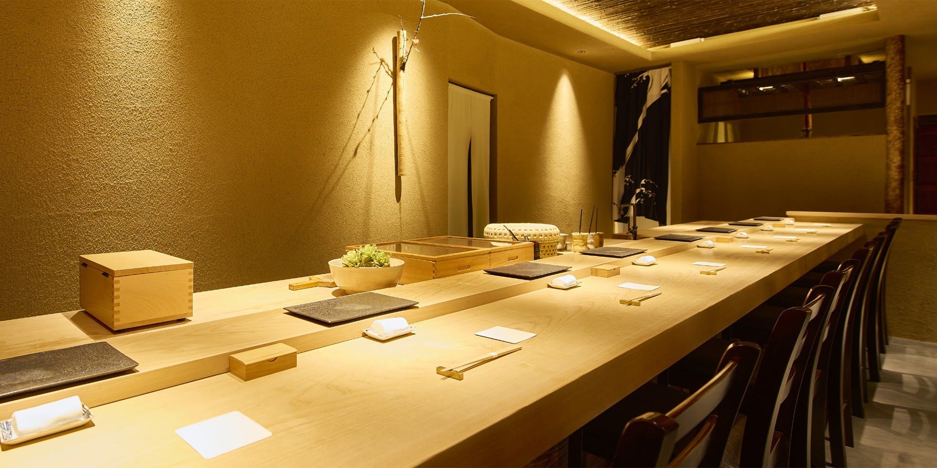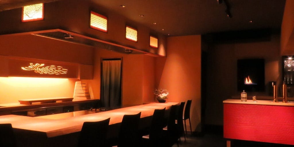 桜で名高い夙川沿いの住宅街に「鮨たかまさ」はあります。坪庭に面した木戸を開くと、そこは風雅な茶室の様な空間。鮨をお愉しみいただける造りです。