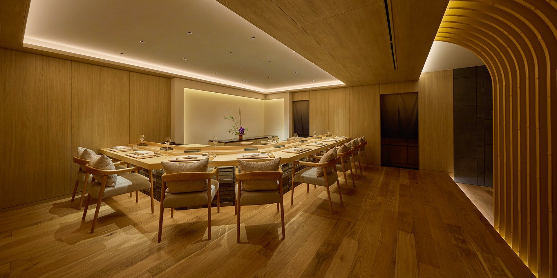 雑居ビル7Fにある、看板のない大人の隠れ家的和食店。落ち着いた空間で、お料理に舌鼓を打つ。