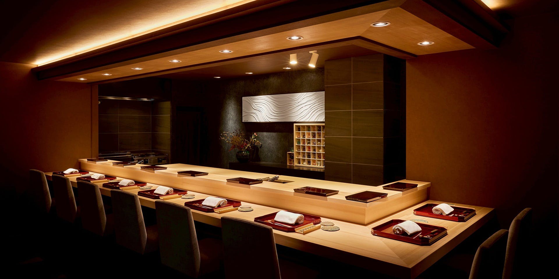 店内のデザインは、会席・寿司・天麩羅・鉄板焼それぞれのサービスをより魅力的に演出し、素材の持ち味を大切にしたお料理をお楽しみ頂けます。